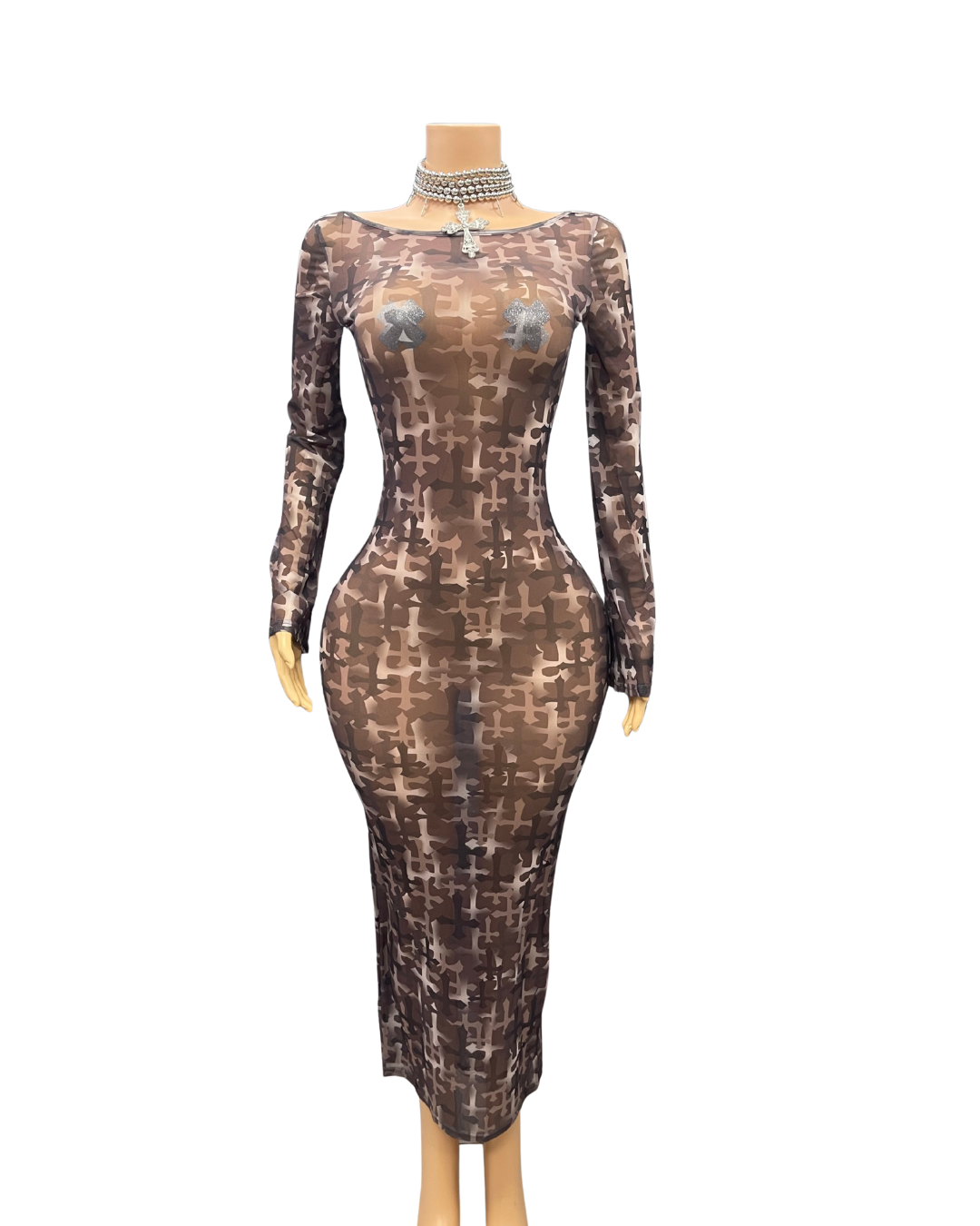 This Crosses Mesh Bodycon Dress features a unique crosses design on a lightweight and breathable mesh fabric. Perfect for those looking to make a bold statement, while staying comfortable and stylish. Elevate your wardrobe with this versatile and eye-catching dress.
