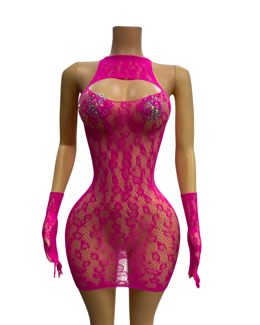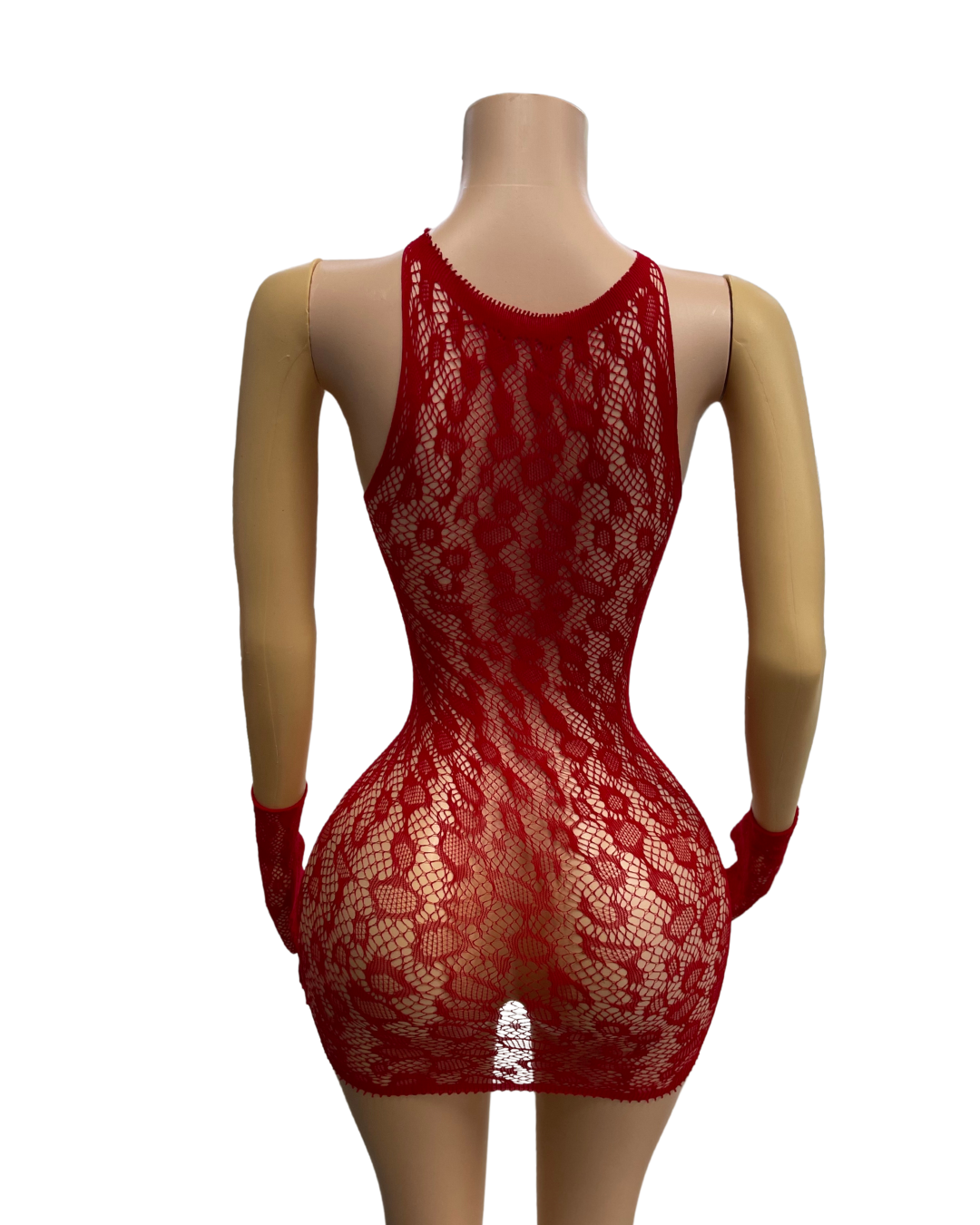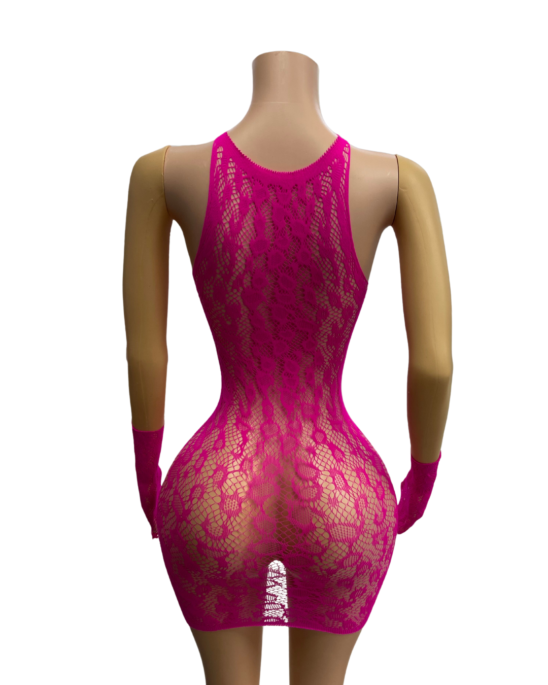 This Fishnet Short Dress with Gloves (#012) offers a bold and alluring look, crafted from high-quality fishnet material that contours the body for a flattering fit. The included gloves complement the dress, enhancing its edgy style while providing a cohesive ensemble. Ideal for confident wearers seeking to make a striking impression, this set combines comfort with provocative design for versatile wear at parties or intimate occasions.