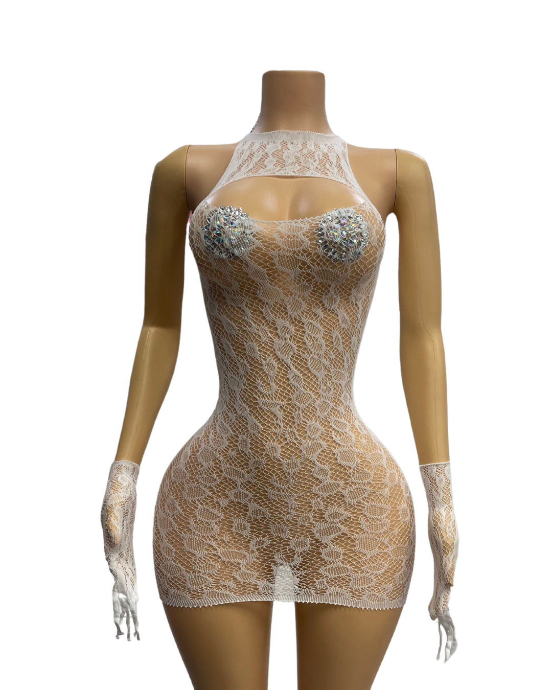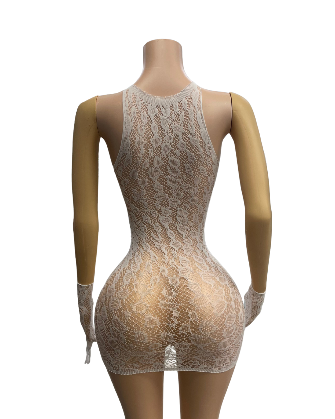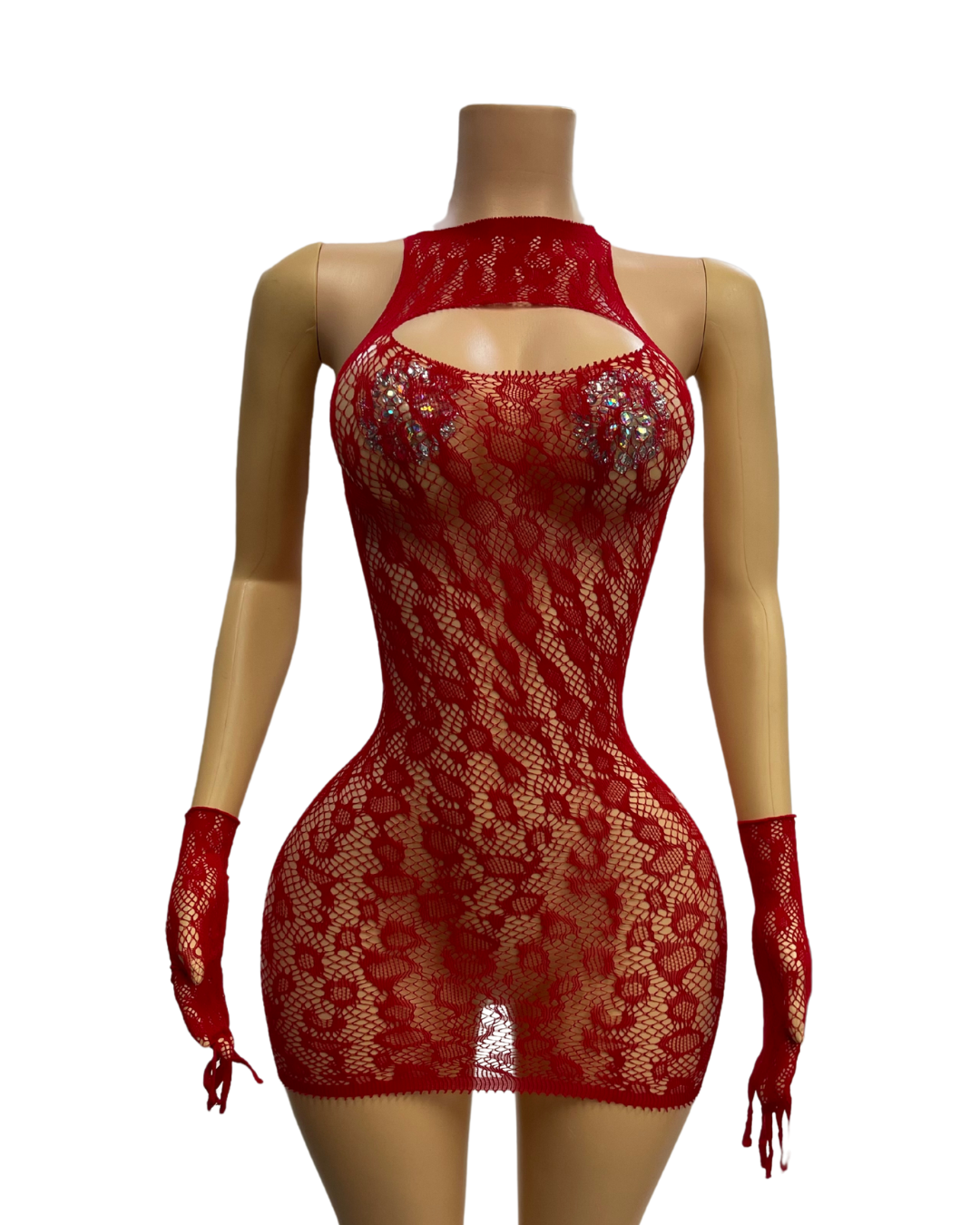 This Fishnet Short Dress with Gloves (#012) offers a bold and alluring look, crafted from high-quality fishnet material that contours the body for a flattering fit. The included gloves complement the dress, enhancing its edgy style while providing a cohesive ensemble. Ideal for confident wearers seeking to make a striking impression, this set combines comfort with provocative design for versatile wear at parties or intimate occasions.
