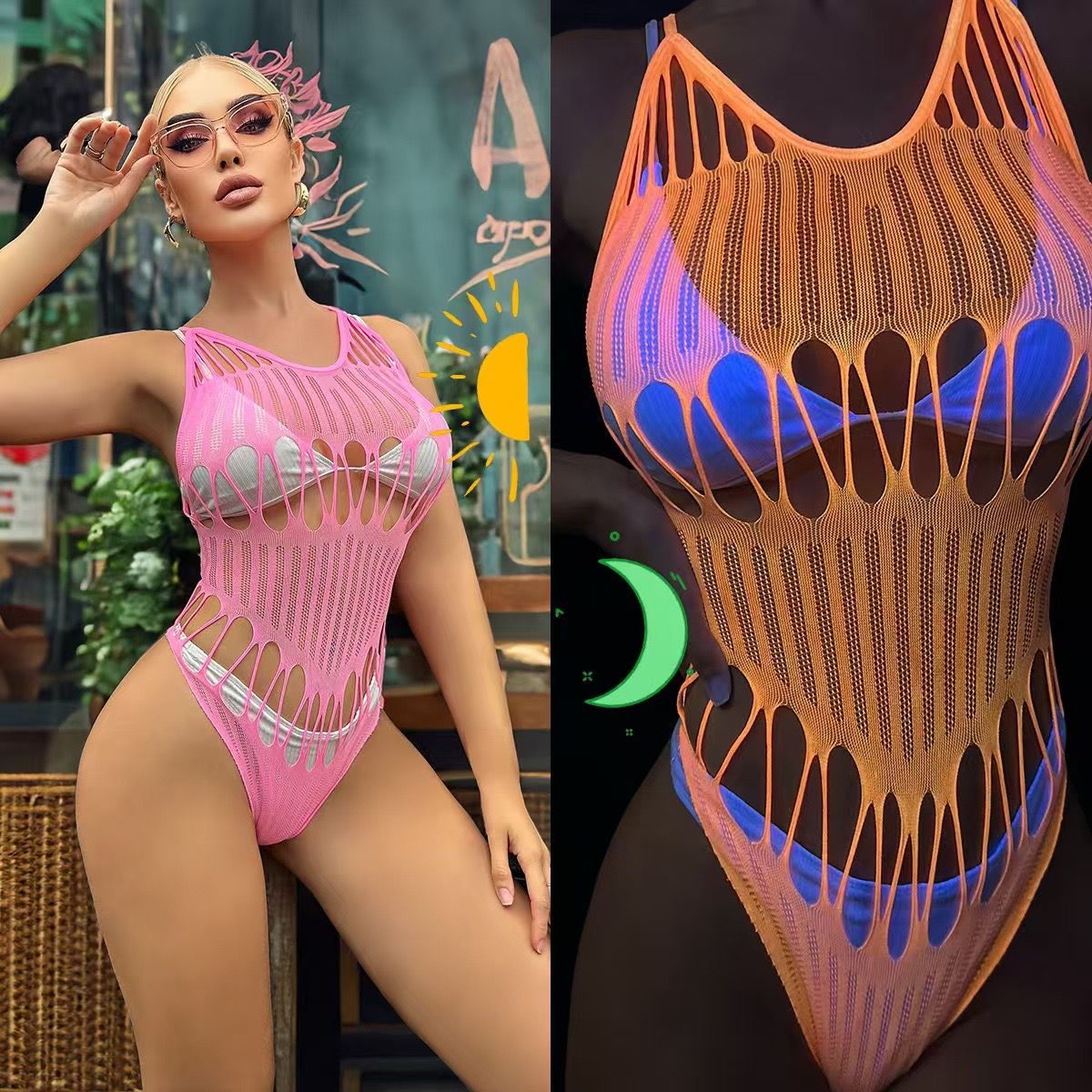 Illuminate the night in this one-piece glow in the dark fishnet . The unique design adds an alluring touch to any outfit, while the glowing feature adds a fun and eye-catching element. Stand out from the crowd and make a statement with this must-have piece.