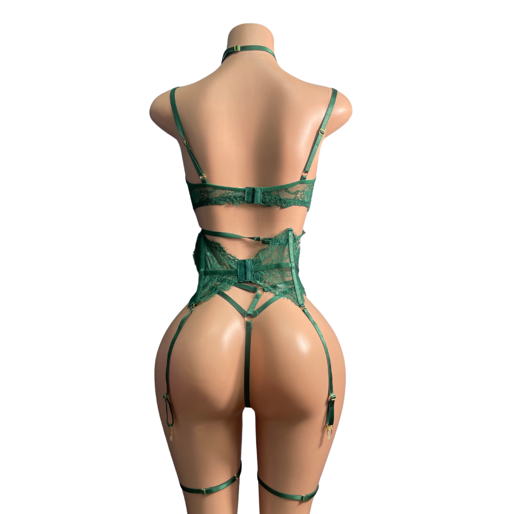 Indulge in luxury and elevate your seductive wardrobe with our Sexy 3pc Lingerie Set. Crafted from a rich, dark green satin, this set includes a delicate neck tie for added allure. Get ready to stun with this sleek and sexy ensemble.